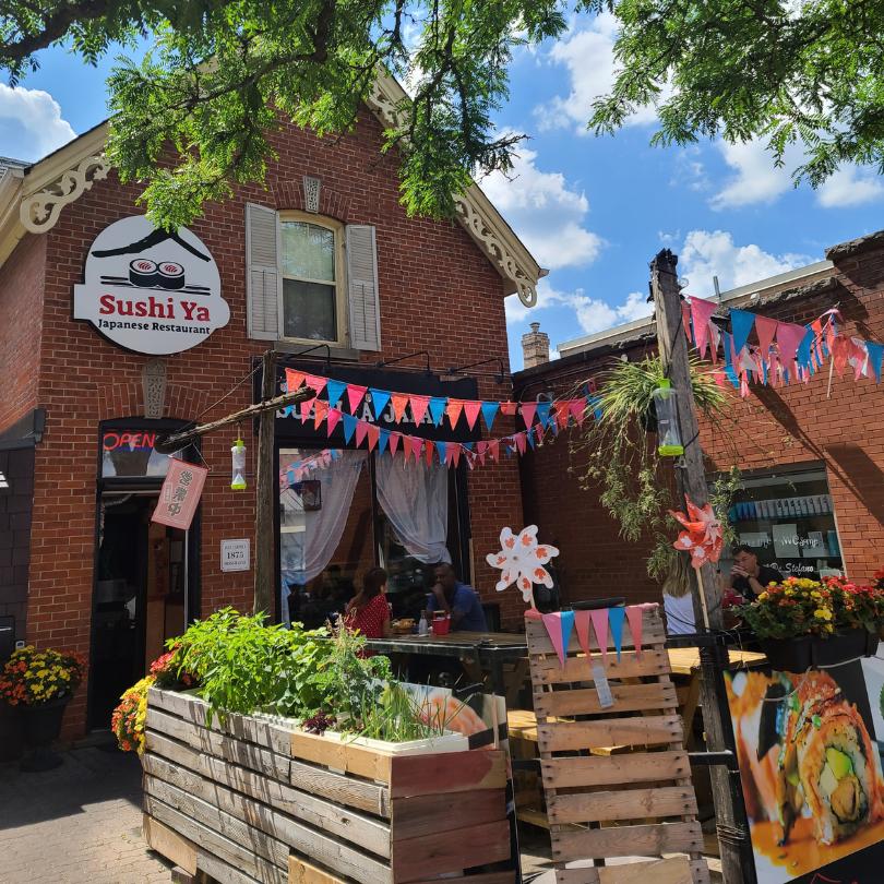 Next up, we have the Sushi-Ya Japan patio located on Martin Street. This space just steps away from Main Street, features beautiful flowers, tasteful decor, and a lovely brick wall, creating a cozy and inviting atmosphere.